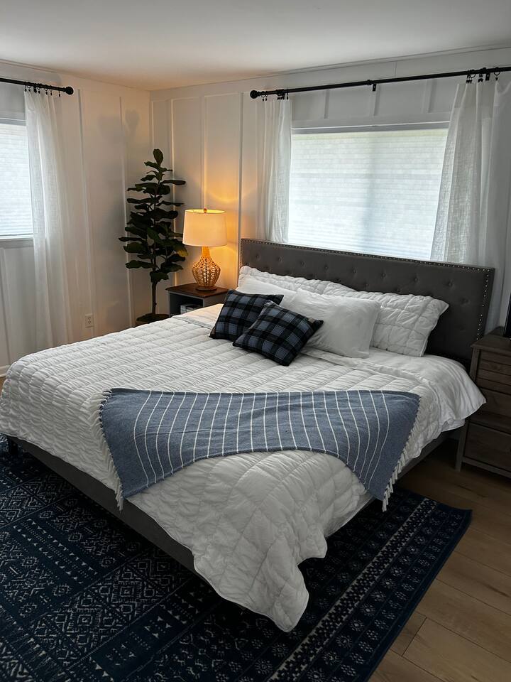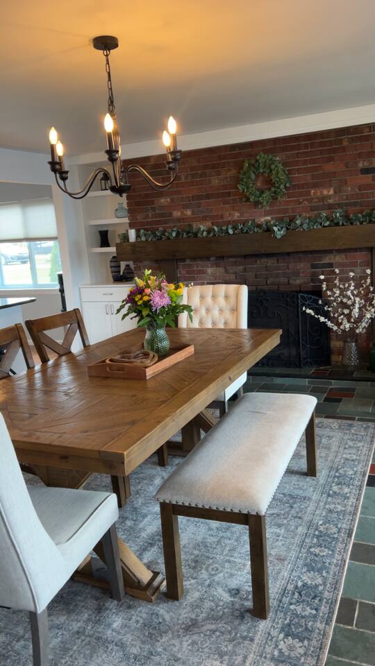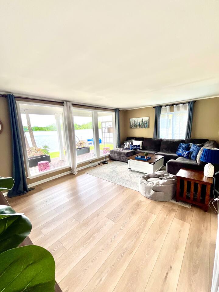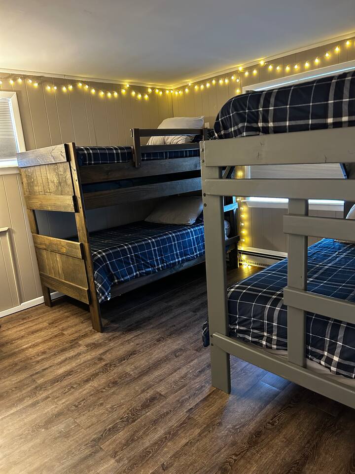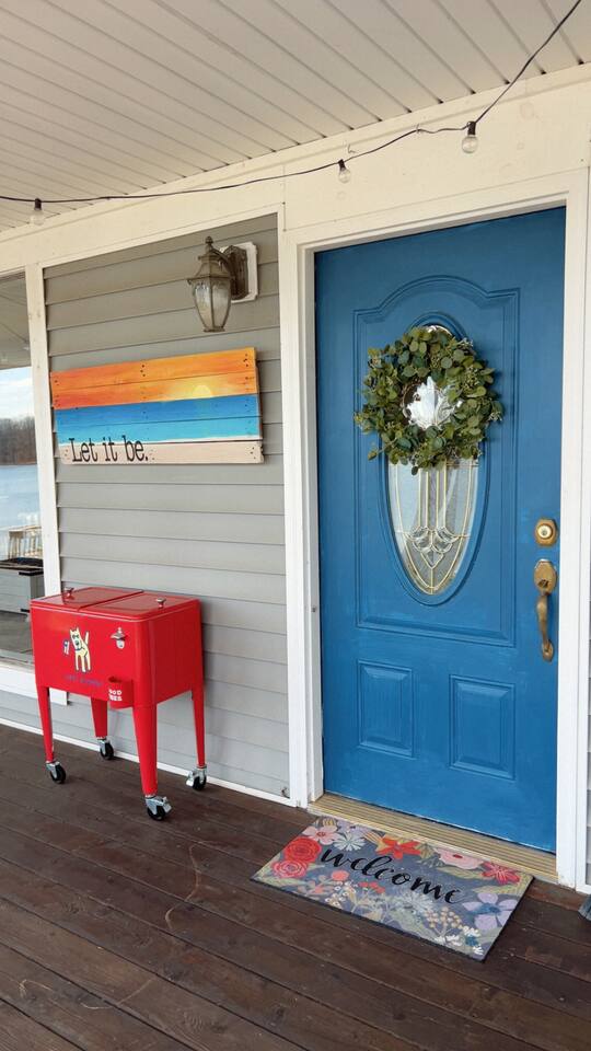 This charming 3-bedroom, 2-bathroom home is your perfect escape for a family getaway, romantic retreat, or a fun weekend with friends. Our casa is your casa! Living & Dining: Relax in the cozy living room on a comfortable sectional sofa with serene views of the lake. Stream your favorites on the 65" Smart TV. The adjacent dining area is perfect for sharing meals or enjoying a game night with provided board games, all while overlooking the water. Kitchen & Laundry: Fully stocked and equipped kitchen with a refrigerator, stove, microwave, and dishwasher. Coffee maker and Keurig provided to start your day right. Convenient in-unit washer and dryer. Bedrooms & Bathrooms (Sleeps 8): Primary Bedroom (1st Floor): Features a comfortable King bed. Second Bedroom (2nd Floor): Offers a Queen bed and a cozy reading chair. Third Bedroom (2nd Floor): Perfect for kids, with two sets of bunk beds. A crib/pack 'n play is also available for those traveling with little ones. Two full bathrooms (one on each floor) stocked with fresh towels, shampoo, conditioner, and body soap. The second-floor bathroom includes a shower/tub combination. Outdoor Living & Fun: Spacious covered deck with cafe lights and outdoor dining furniture. Private sandy beach and dock on 64 feet of private shoreline. BBQ grill for afternoon cookouts. Fire pit for evenings under the stars. Ping pong table for friendly competition.